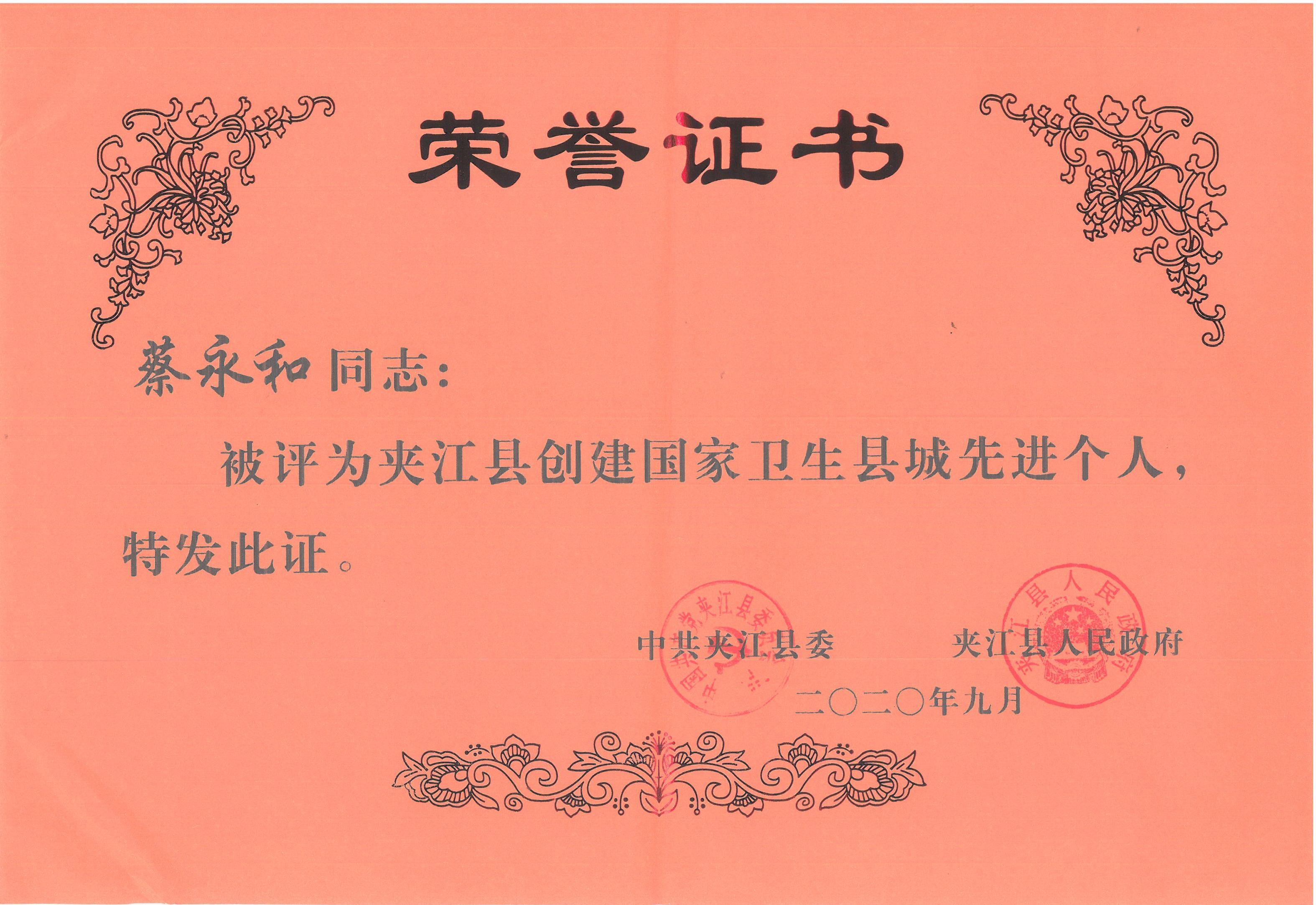 祝贺夹江垃圾处理分公司蔡永和同志被评为“夹江县创建国家卫生县城先进个人”